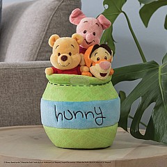 Welcome baby into the Hundred Acre Wood with a comforting, skill building plush set! Perfect for travel, these 4" classic plush pals fit inside the 6" hunny carry case. Little learners embark on a sensory adventure as they discover Winnie the Pooh's chime rattle, Piglet's crinkle, and Tigger's squeaker. You'll hear giggles and gurgles as babies place their friends inside the hunny pot and then remove them, over and over!